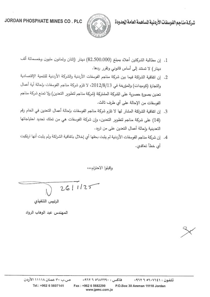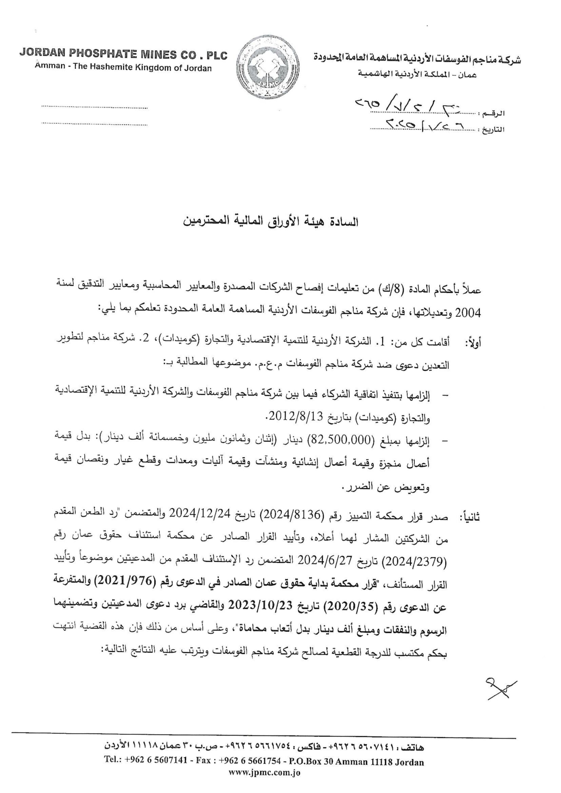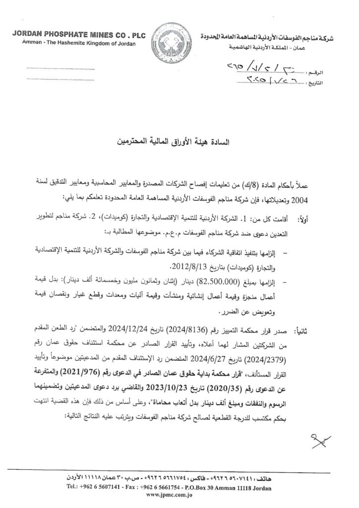 عمان. افصحت شركة مناجم الفوسفات الأردنية عبر موقع  هيئة الأوراق المالية عن كسبها قضية بقيمة 82.5 مليون دينار ضد شركة كوميدات وشركة مناجم لتطوير التعدين.