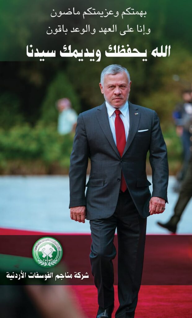 شركة مناجم الفوسفات الأردنية تعبر عن اعتزازها بالمواقف الشجاعة المشرفة لجلالة الملك عبد الله الثاني في الدفاع عن قضايا الأمة، ومعا يا سيدي في مسيرتكم المظفرة.